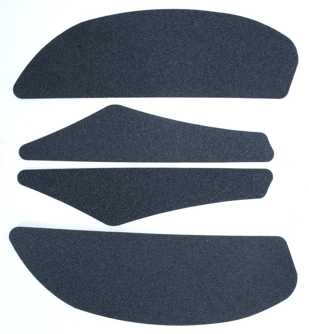 R&G Tank Traction Pad kits are available for many different bike styles and brands, with new applications released regularly. The unique R&G Traction Pad texture was specifically designed to be both soft and durable, providing the rider with the grip and feel he/she needs to assist in better bike control, enabling the rider to maintain a stable body position while cornering and braking, whilst also relieving fatigue and providing the rider with complete confidence allowing him/her to fully focus on the road (or track) ahead instead of slipping and sliding on the tank. Each Tank Traction Pad kit is supplied with precision pre-cut adhesive pieces, designed to fit the intended bike, typically in either 2, 4 or 6 pieces (in total) depending on the shape of the tank and adjoining fairing. The high-strength adhesive backing ensures a highly durable product that will stay exactly where you put it, as well as not affecting or damaging paintwork. Each R&G Tank Traction Pad kit is available in black and ultra-clear finishes to blend into your bike’s paintwork or stand out, depending on your preference. R&G Tank Traction works in both wet and dry conditions and is equally at home on the track as it is on the commute home! Please note: R&G Traction Pads now come with a 25mm diameter stick on emblem. This 4-piece Tank Traction Grip set has been specially designed for the Aprilia RSV4 '09-, Tuono V4 '11- &  RSV4 1100 Factory '19-'20- Made in the UK.