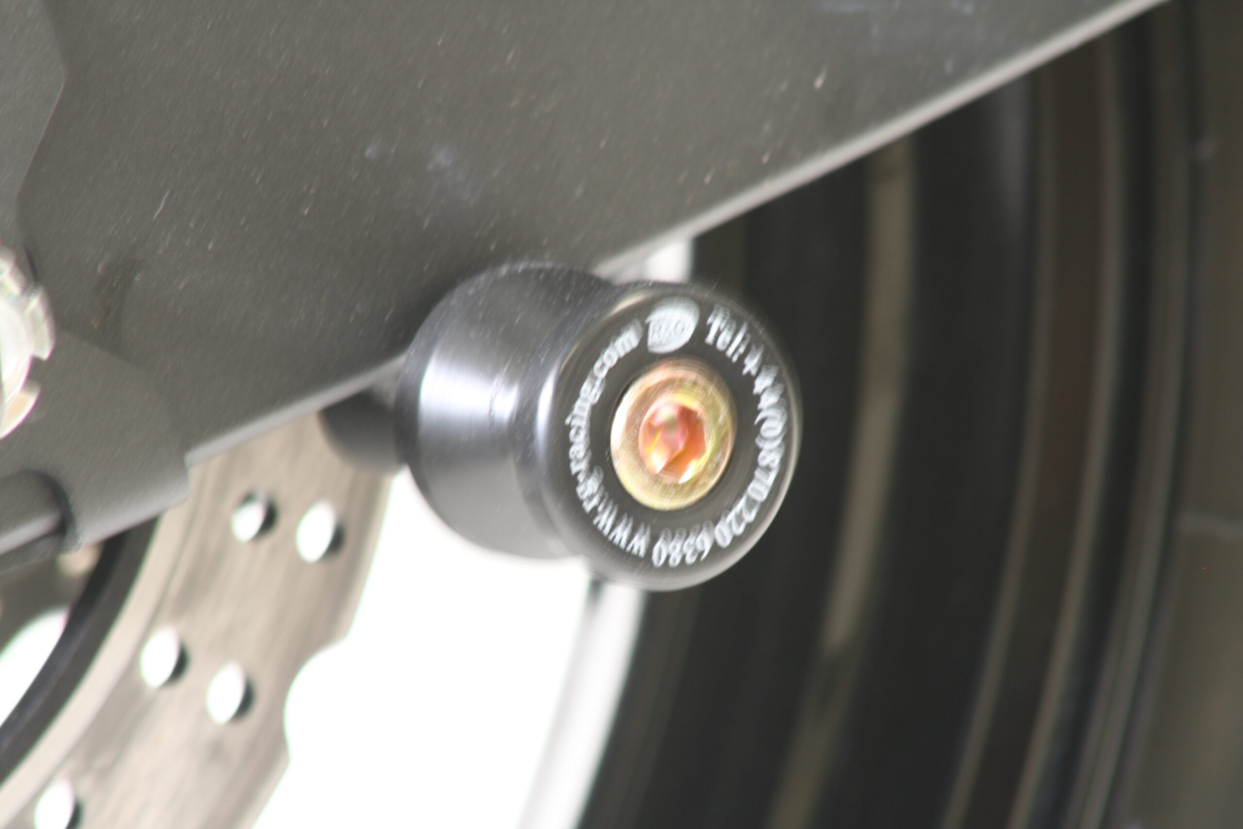 These R&G cotton reels mount to the paddock stand mounting points on the rear swingarm; dual purpose they offer both crash protection, protecting the expensive and important rear drive and braking components as well as offer the ability to lift the bike up onto a paddock stand for chain adjustment, tyre changes and general cleaning.