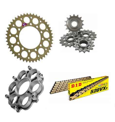 A very high quality replacement kit, consisting of Renthal Steel Front Sprocket, Renthal Hard-Anodised Alloy Rear Sprocket (dark gold), Renthal Rear Chainwheel Carrier and D.I.D VXGB X-Ring Gold Drive Chain. Supplied with standard sprocket sizes and chain pitch.