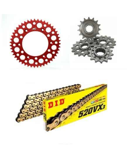 A very high quality replacement kit, consisting of Renthal Steel Front Sprocket, Renthal Alloy Rear Sprocket , and D.I.D VXGB X-Ring Gold Drive Chain